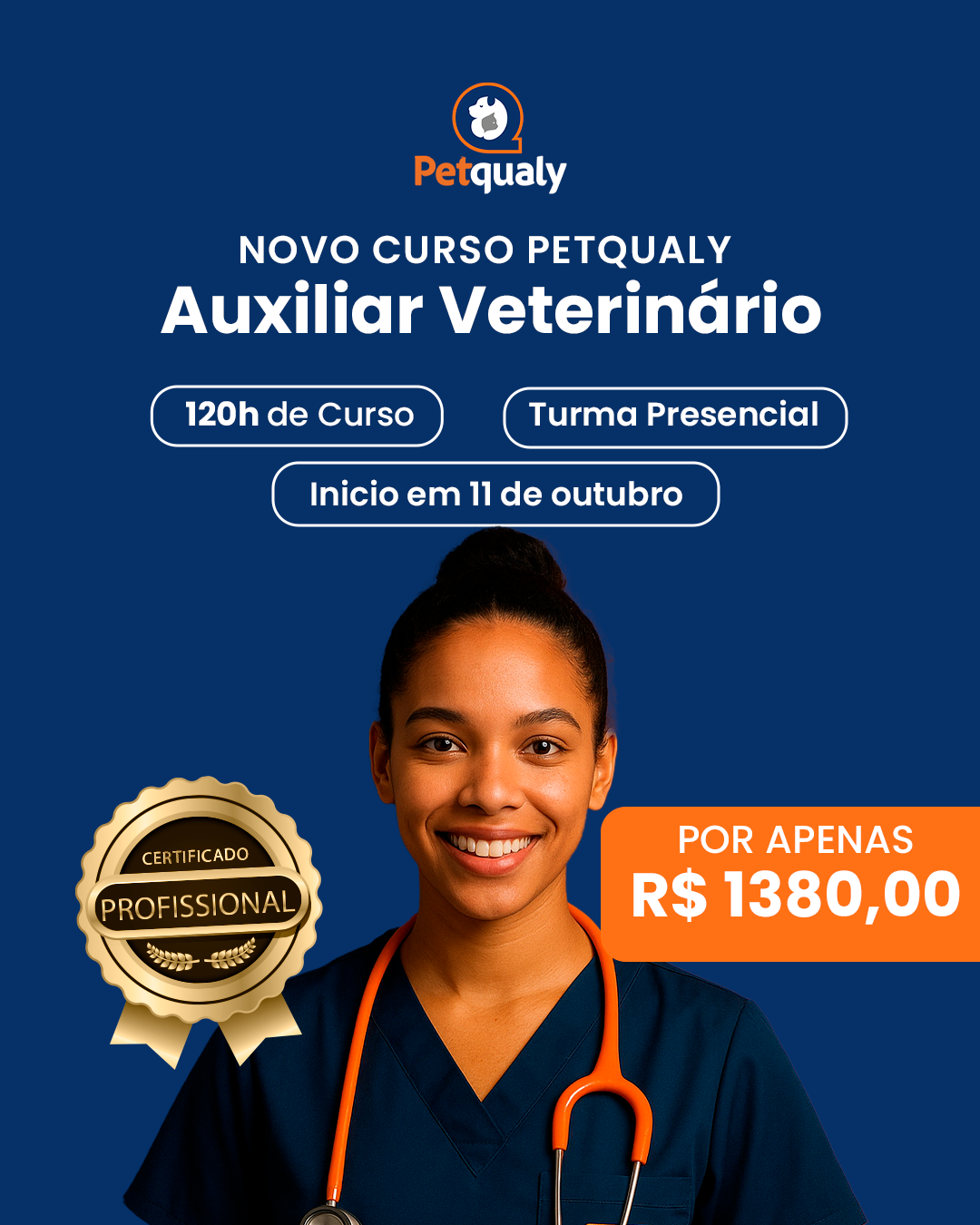 O Curso de Auxiliar Veterinário da Pet Qualy é 100% presencial, com 240h de formação completa e prática em clínica parceira. Aprenda tudo o que o mercado exige para atuar em hospitais, pet shops e serviços especializados com ética, técnica e confiança.